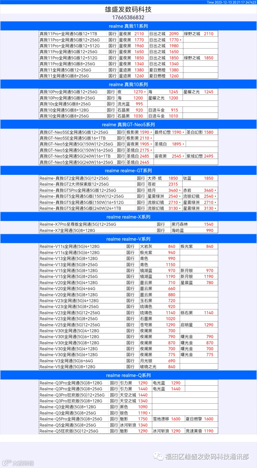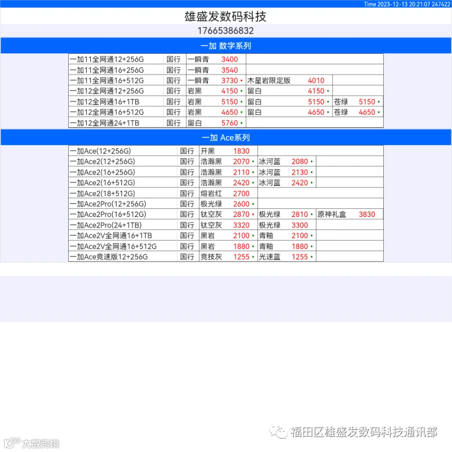 新机报价【2023年12月13日】OPPO VIVO IQOO 一加 真我