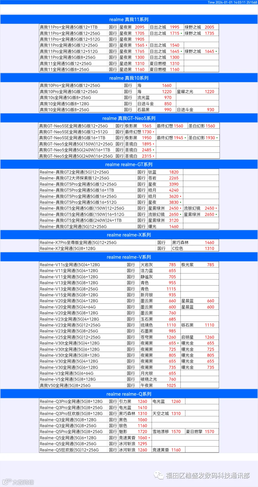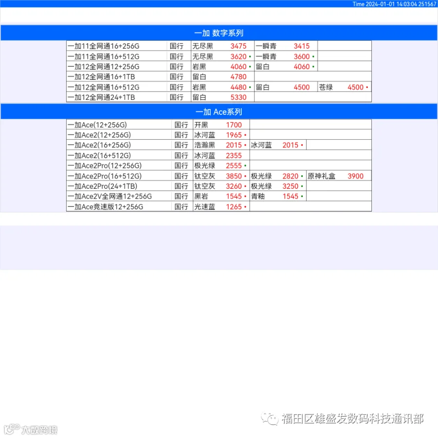新机报价【2024年1月1日】OPPO VIVO IQOO 一加 真我