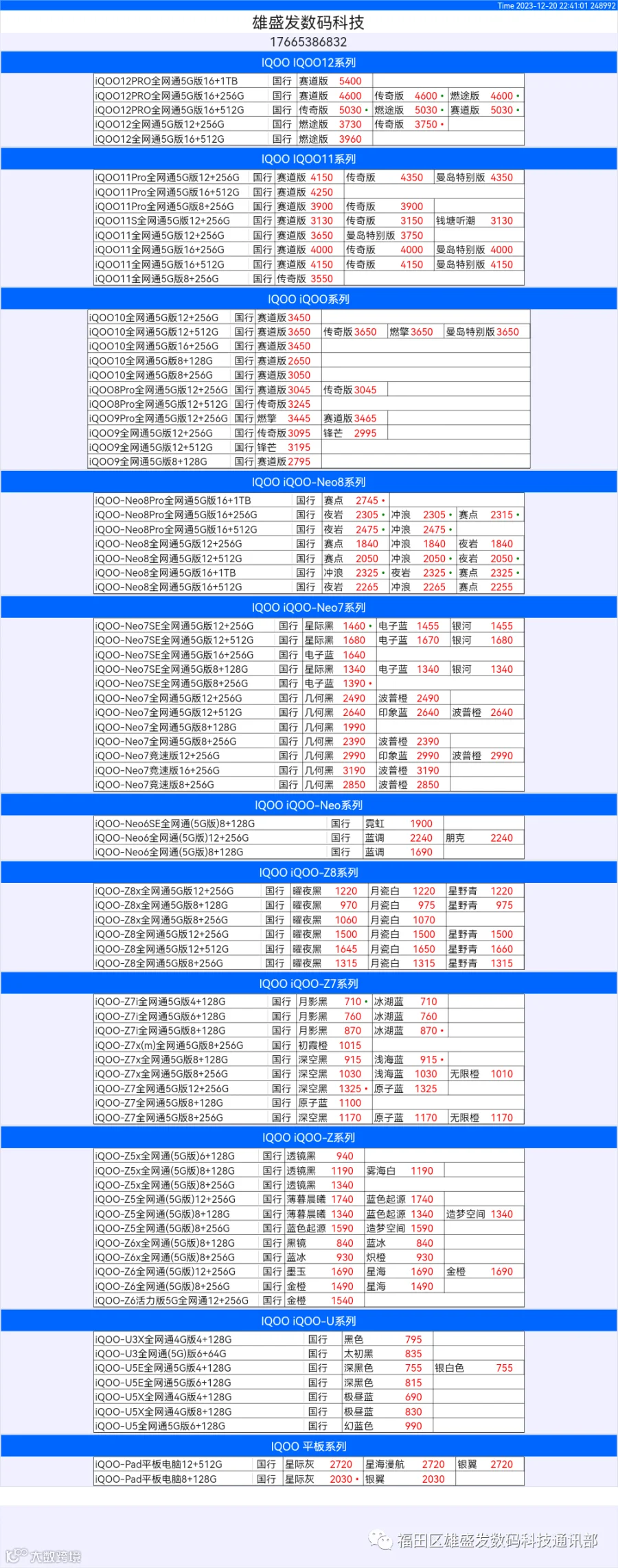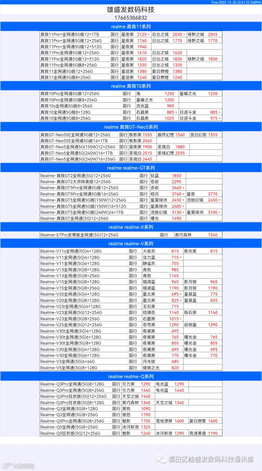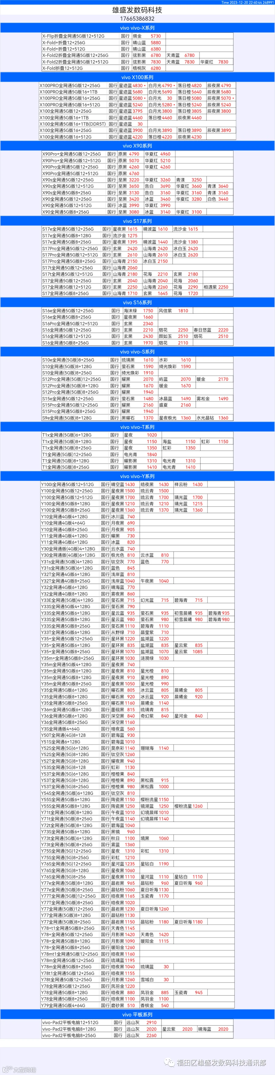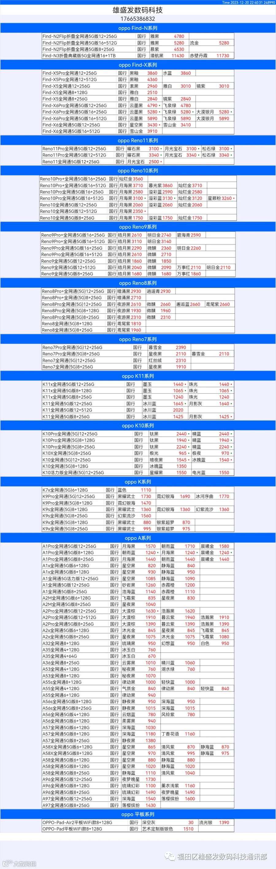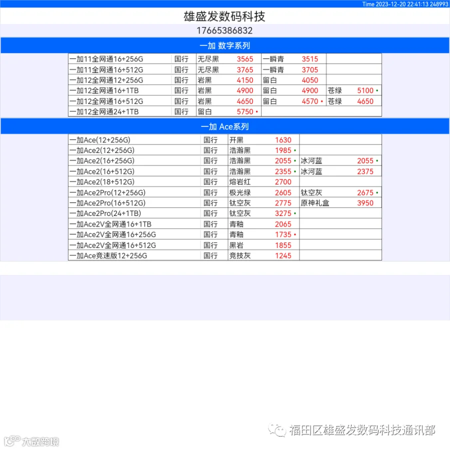 新机报价【2023年12月20日】OPPO   VIVO  IQOO   一加   真我 芯烨微 电子科技
