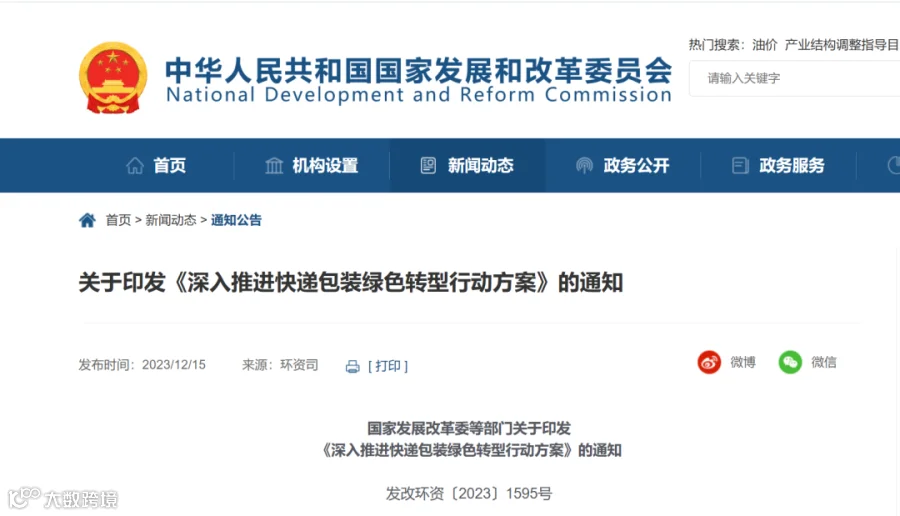 12月15日,国家发改委等部门发布的关于印发《深入推进快递包装绿色转型行动方案》(以下简称《方案》)的通知指出,《方案》已经国务院同意并印发。