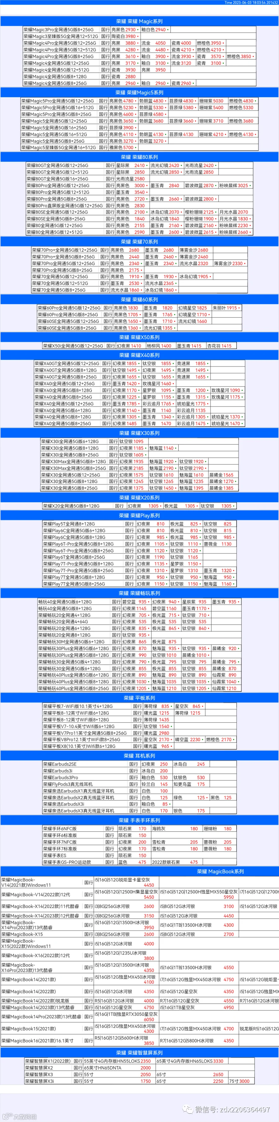 新机报价【2023年6月3日】华为 荣耀 报价