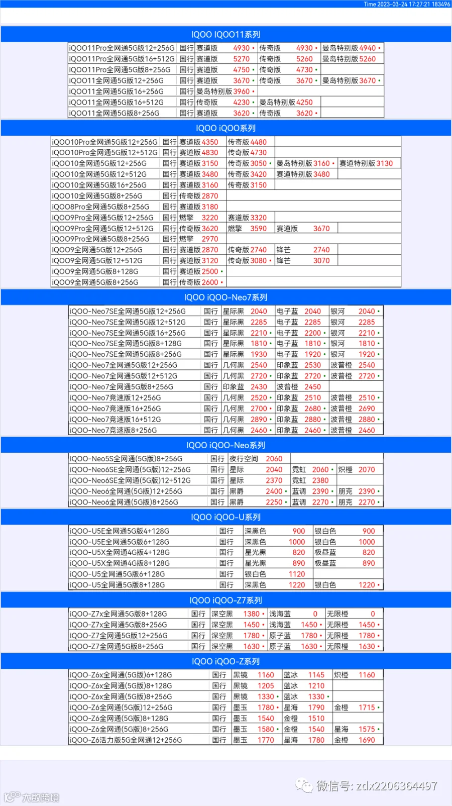 新机报价【2023年3月24日】OPPO VIVO IQOO 一加 真我
