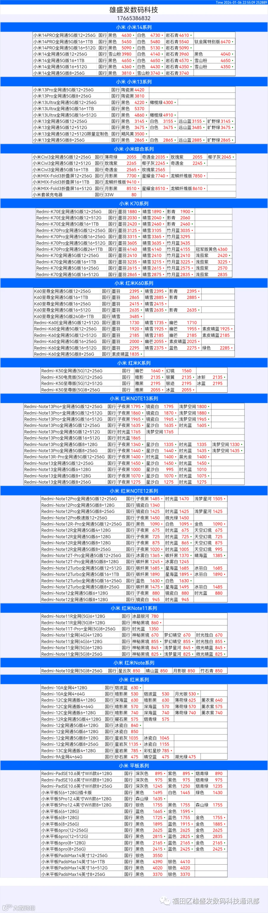 新机报价【2024年1月6日】小米  红米   黑鲨   报价 芯烨微 电子科技