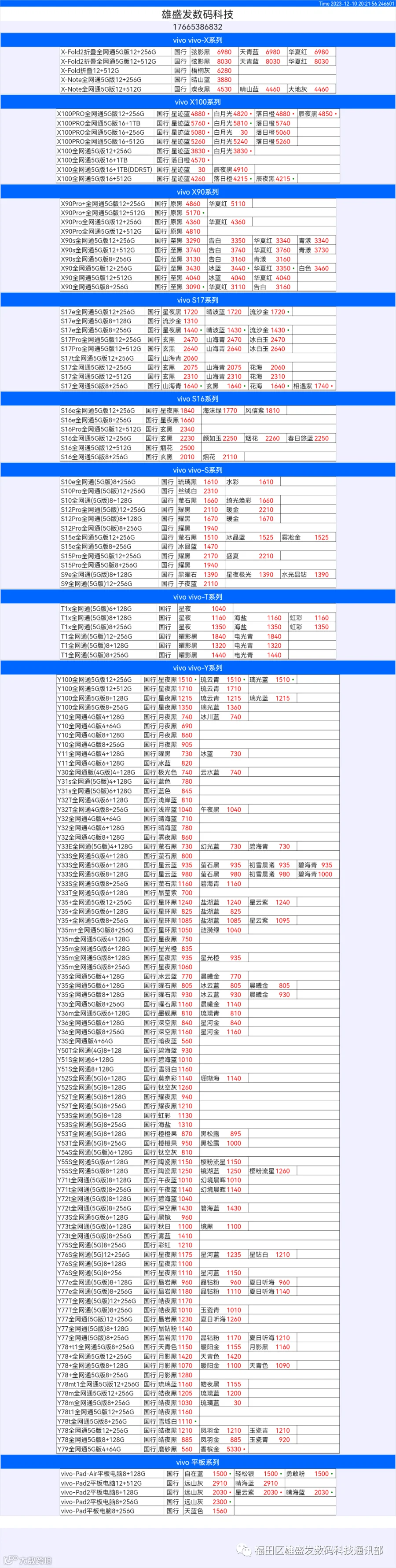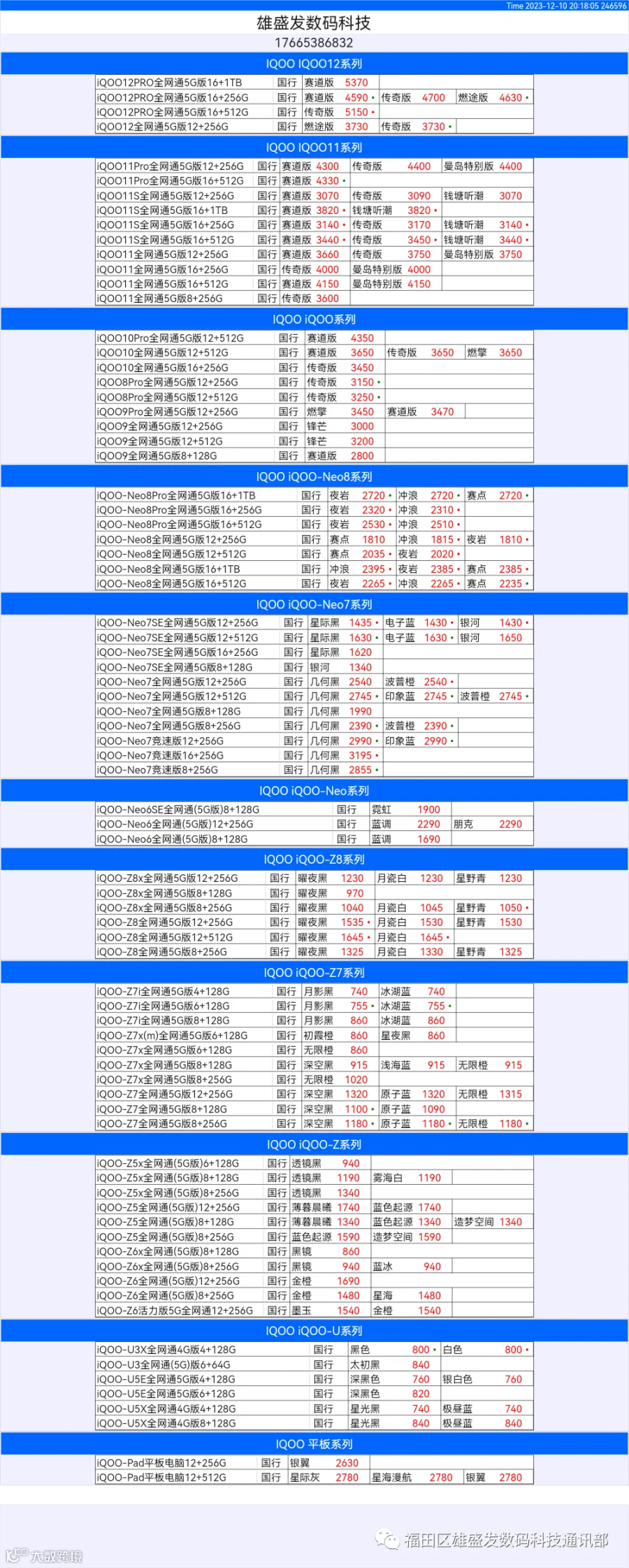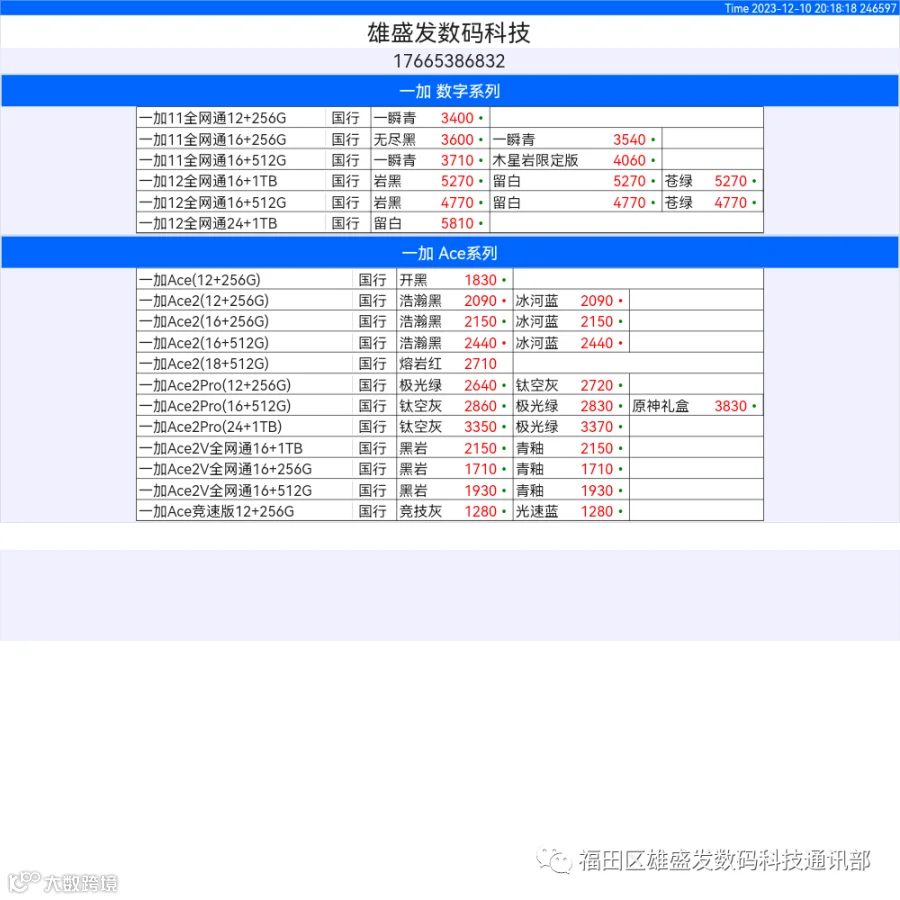 新机报价【2023年12月10日】OPPO   VIVO  IQOO   一加   真我 芯烨微 电子科技
