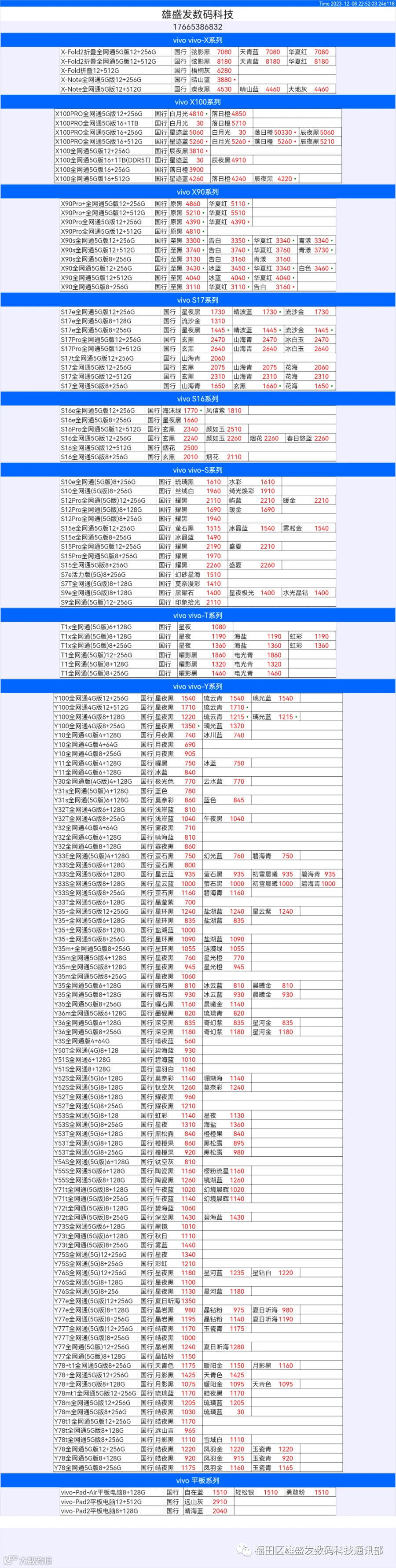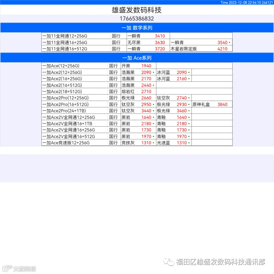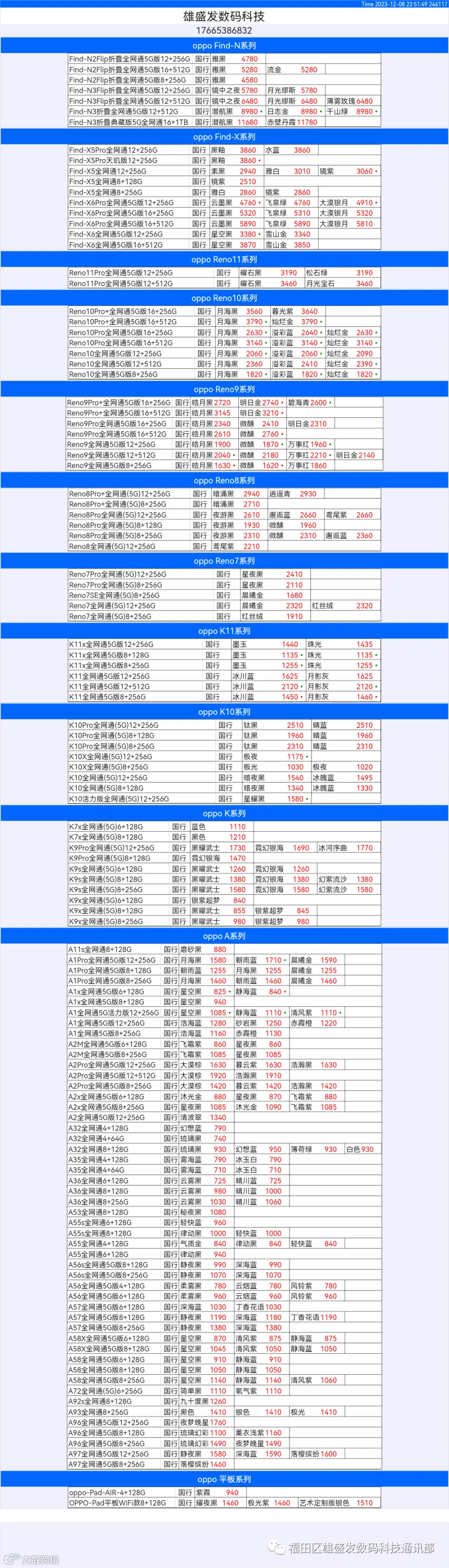 新机报价【2023年12月8日】OPPO   VIVO  IQOO   一加   真我 芯烨微 电子科技