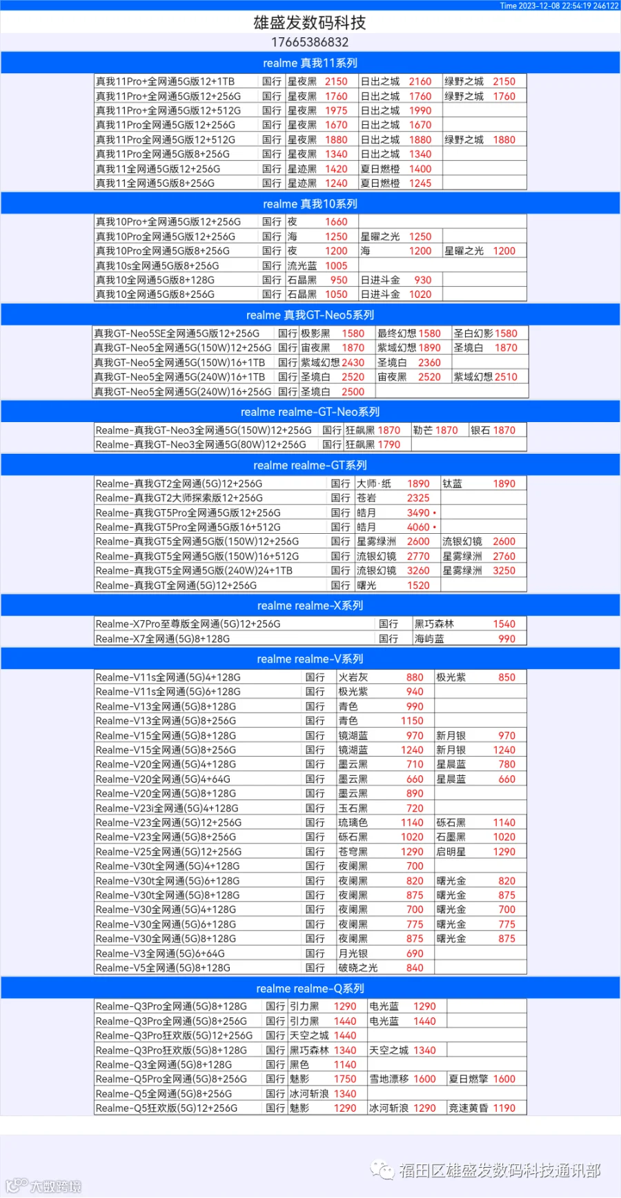 新机报价【2023年12月8日】OPPO VIVO IQOO 一加 真我