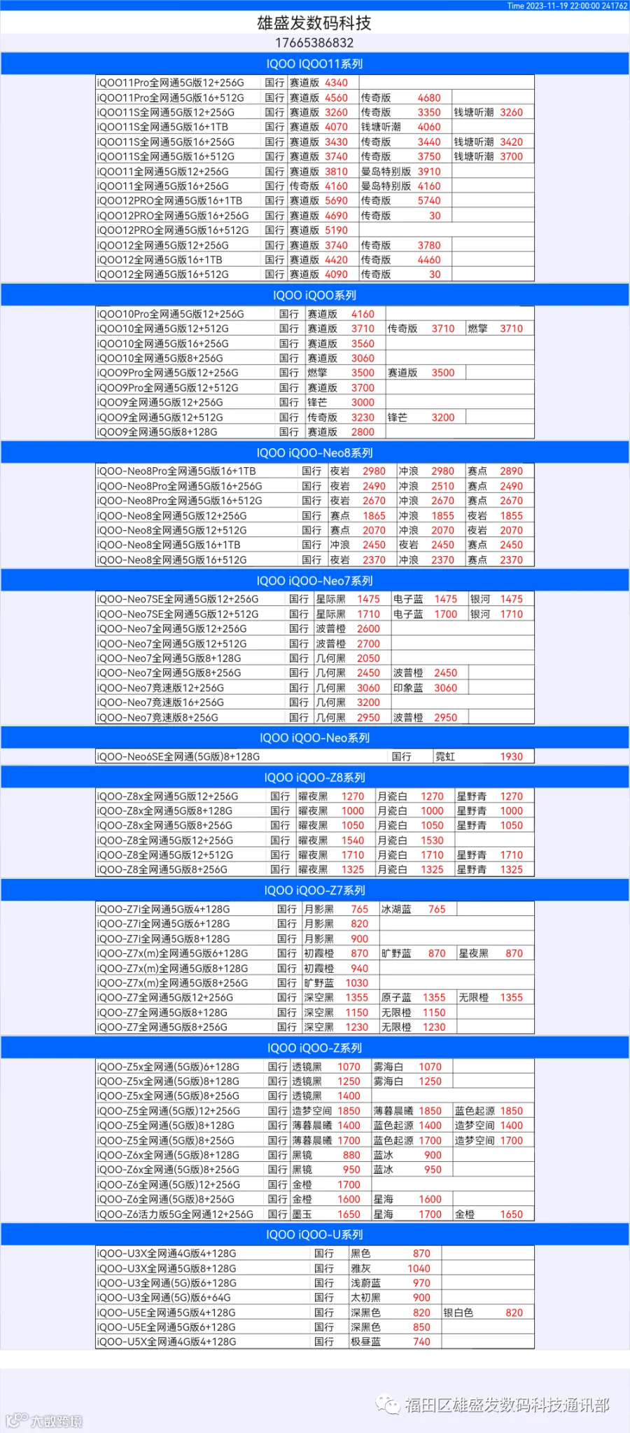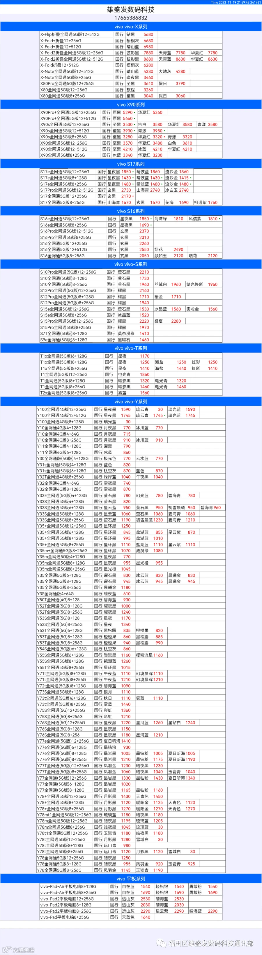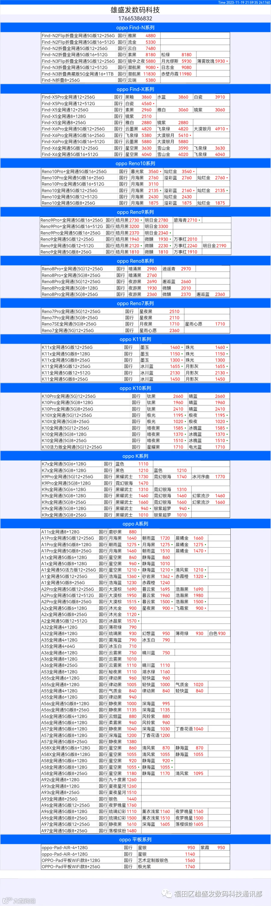 新机报价【2023年11月19日】OPPO   VIVO  IQOO   一加   真我 芯烨微 电子科技