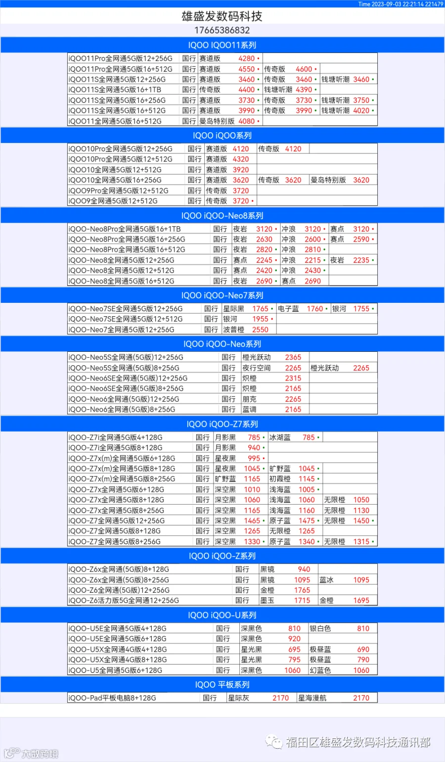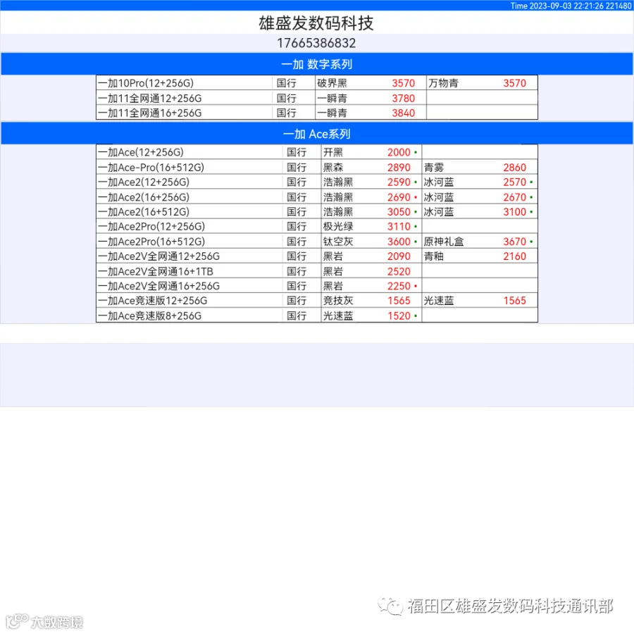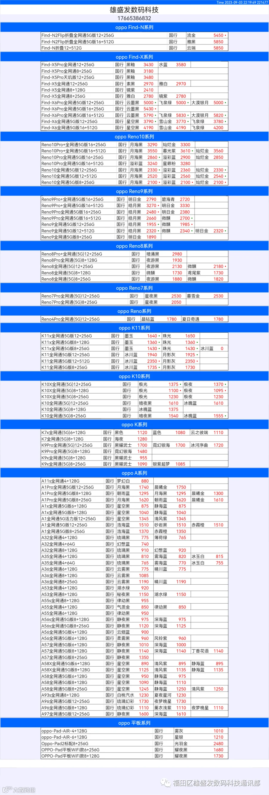 新机报价【2023年9月3日】OPPO   VIVO  IQOO   一加   真我 芯烨微 电子科技