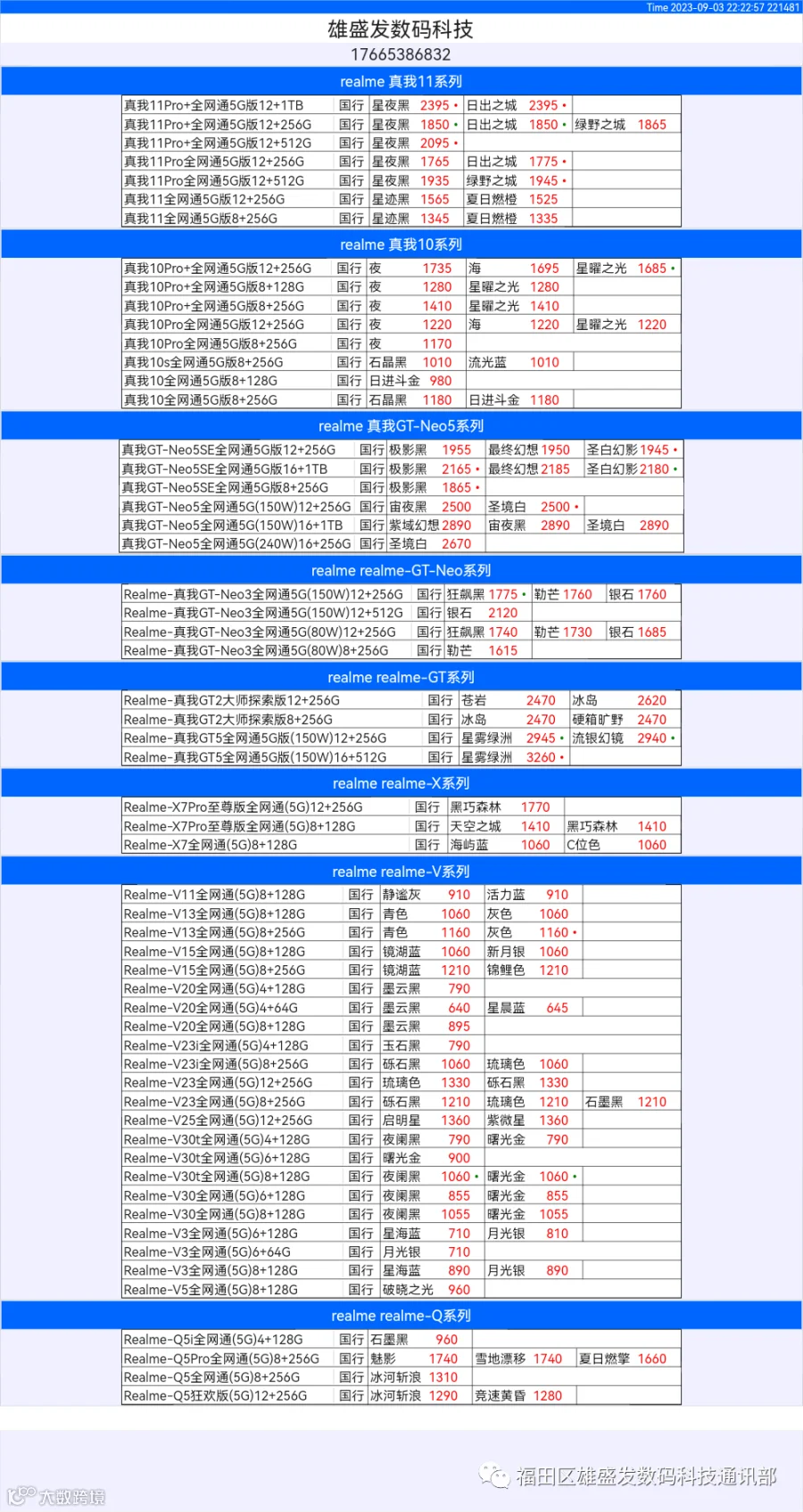 新机报价【2023年9月3日】OPPO VIVO IQOO 一加 真我