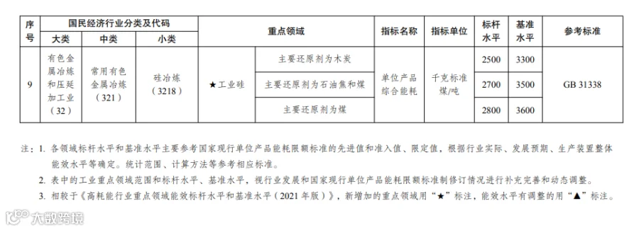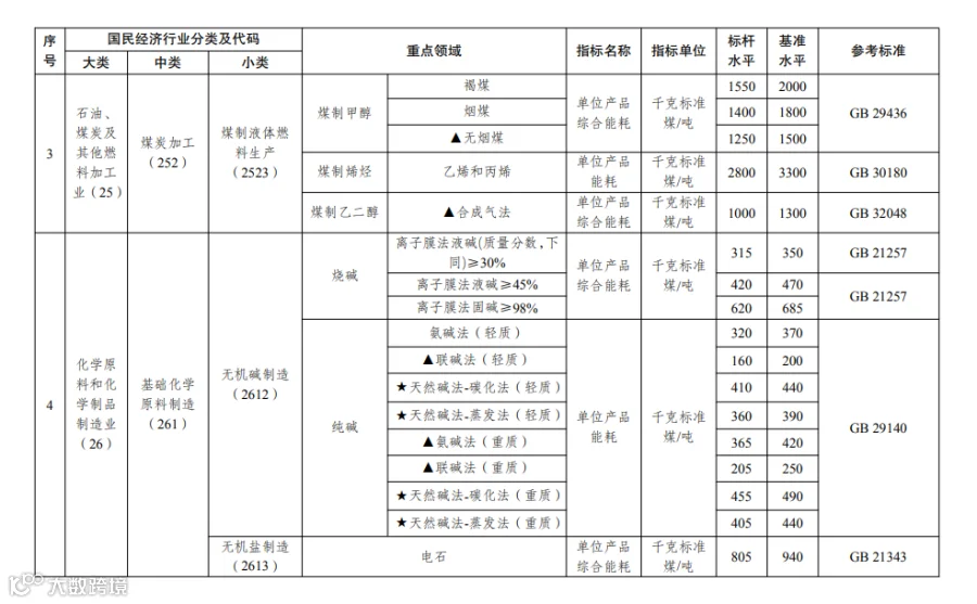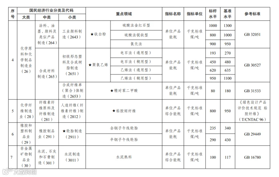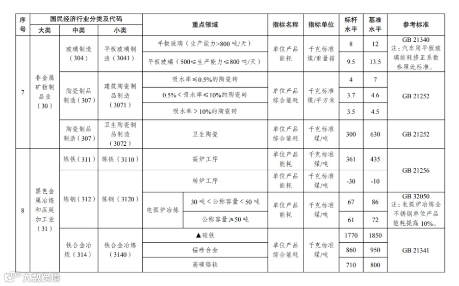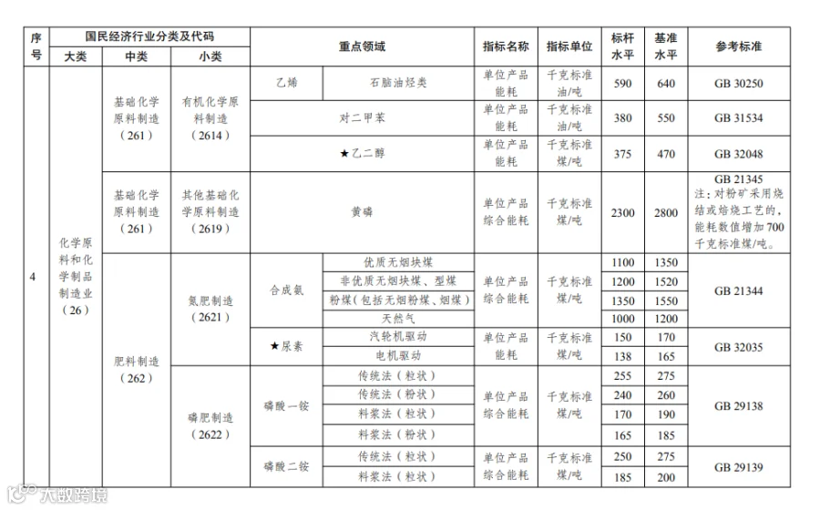 结合工业重点领域产品能耗、规模体量、技术现状和改造潜力等,进一步拓展能效约束领域。在此前明确炼油、煤制焦炭、煤制甲醇、煤制烯烃、煤制乙二醇、烧碱、纯碱、电石、乙烯、对二甲苯、黄磷、合成氨、磷酸一铵、磷酸二铵、水泥熟料、平板玻璃、建筑陶瓷、卫生陶瓷、炼铁、炼钢、铁合金冶炼、铜冶炼、铅冶炼、锌冶炼、电解铝等25个重点领域能效标杆水平和基准水平的基础上,增加乙二醇,尿素,钛白粉,聚氯乙烯,精对苯二甲酸,子午线轮胎,工业硅,卫生纸原纸、纸巾原纸,棉、化纤及混纺机织物,针织物、纱线,粘胶短纤维等11个领域,进一步扩大工业重点领域节能降碳改造升级范围。