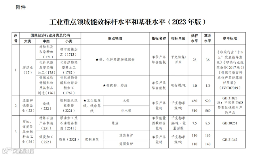 为贯彻党的二十大关于统筹产业结构调整、推动制造业绿色发展、推进工业等领域清洁低碳转型的精神,落实中央经济工作会议关于推动传统产业改造升级的要求,按照《关于严格能效约束推动重点领域节能降碳的若干意见》(发改产业〔2021〕1464号),经商有关方面,现发布《工业重点领域能效标杆水平和基准水平(2023年版)》,并就有关事项通知如下。