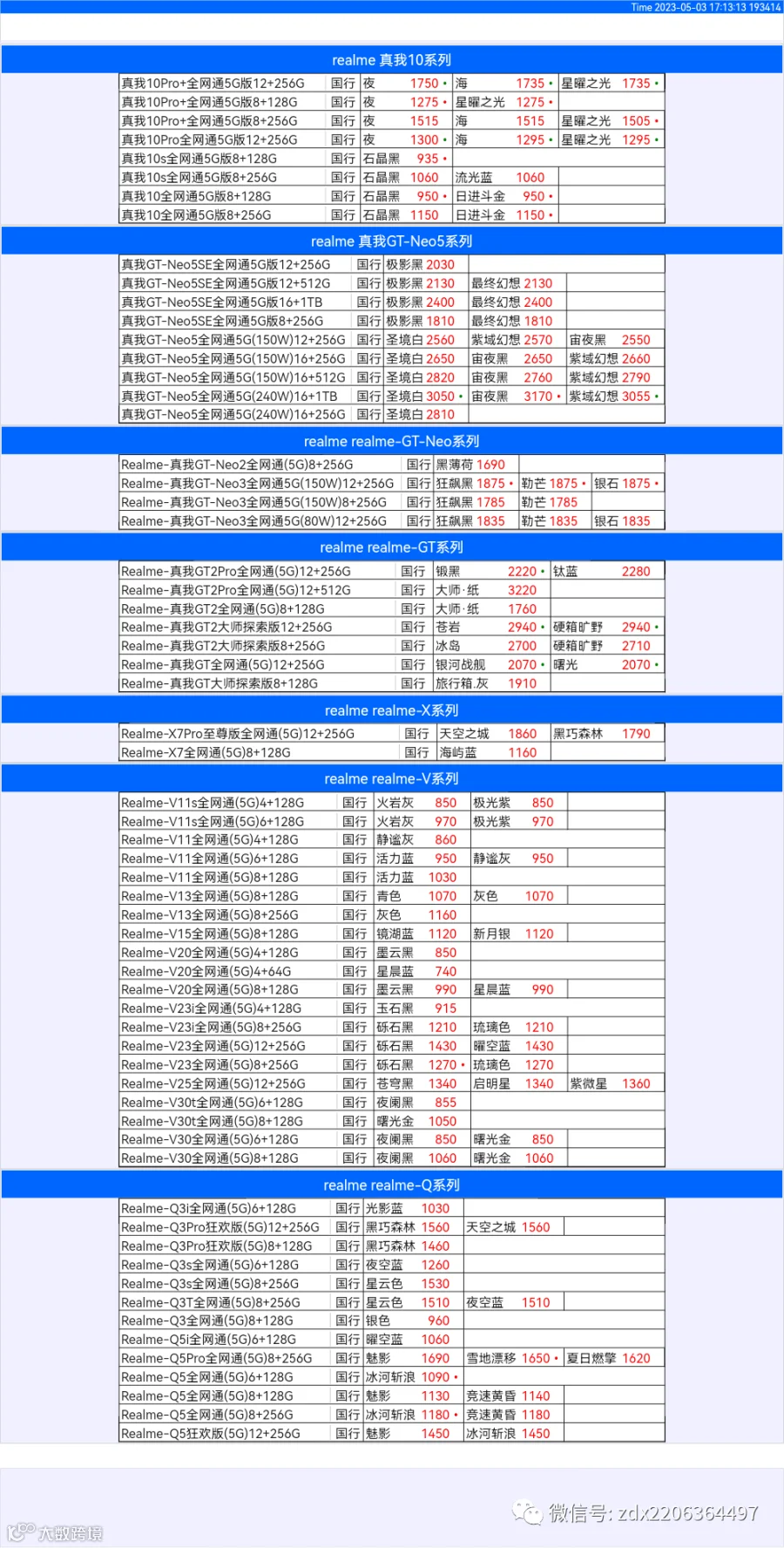 新机报价【2023年5月3日】OPPO VIVO IQOO 一加 真我