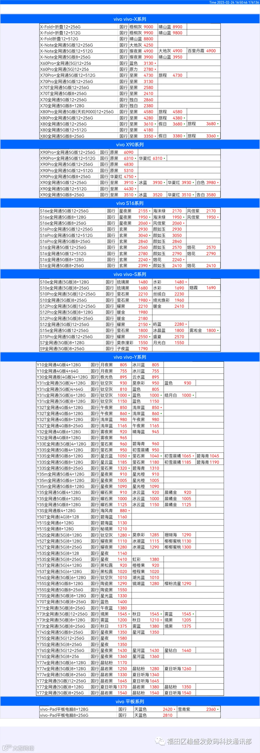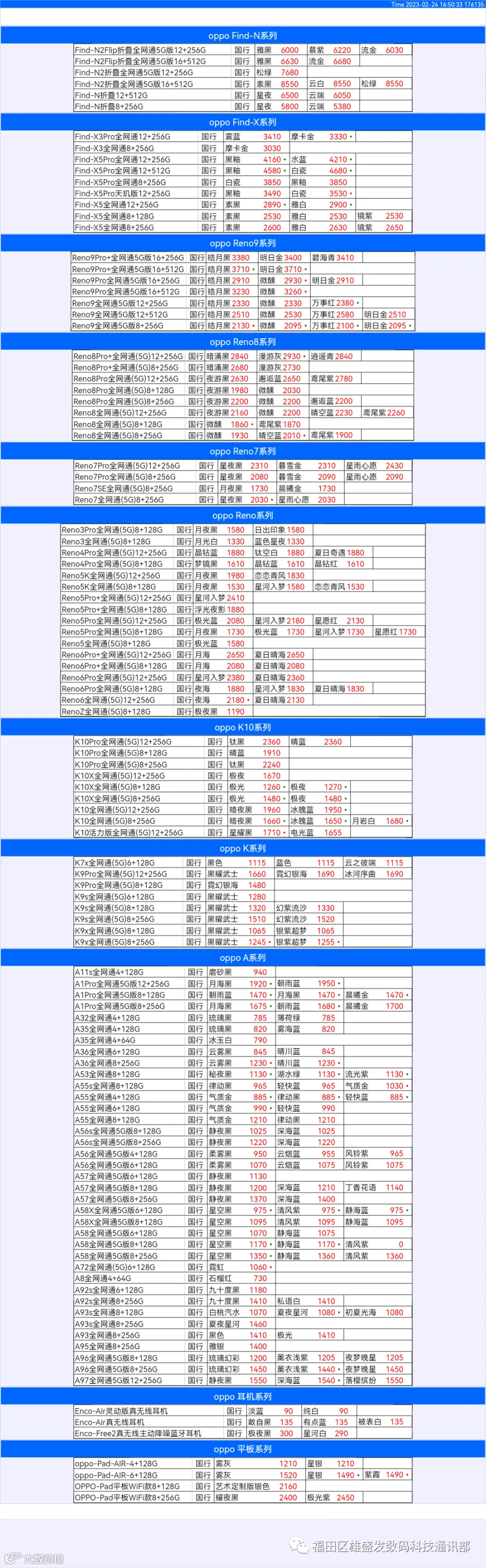 新机报价【2023年2月24日】OPPO   VIVO  IQOO   一加   真我 芯烨微 电子科技