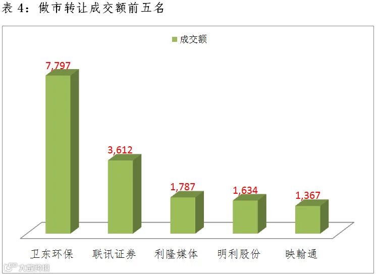 做市企业中有841只个股参与交易,成交额4.94亿元。其中358只个股上涨,345只个股下跌;9家做市企业成交额破千万,成交额前三名为卫东环保7797万、联讯证券3612万、利隆媒体1787万。