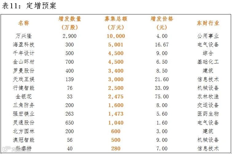 4月5日,共有14家公司公布定增预案,总增发股数6456万股,共募集资金4.08亿元。募集资金达到1亿元的一家,募集资金最大为万兴隆,募集资金1亿元。总体来看,募集金额流向公用事业较多。