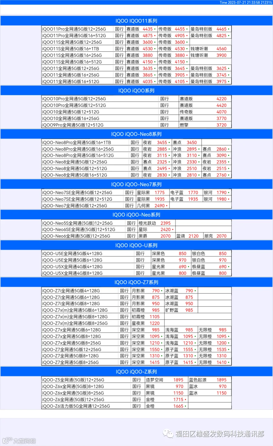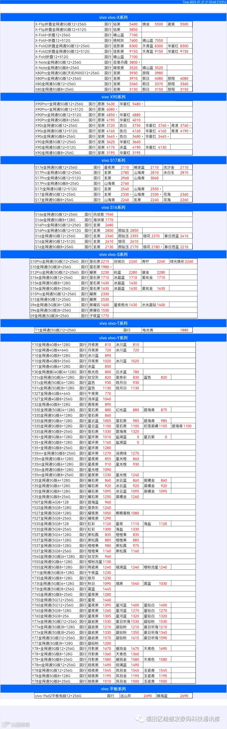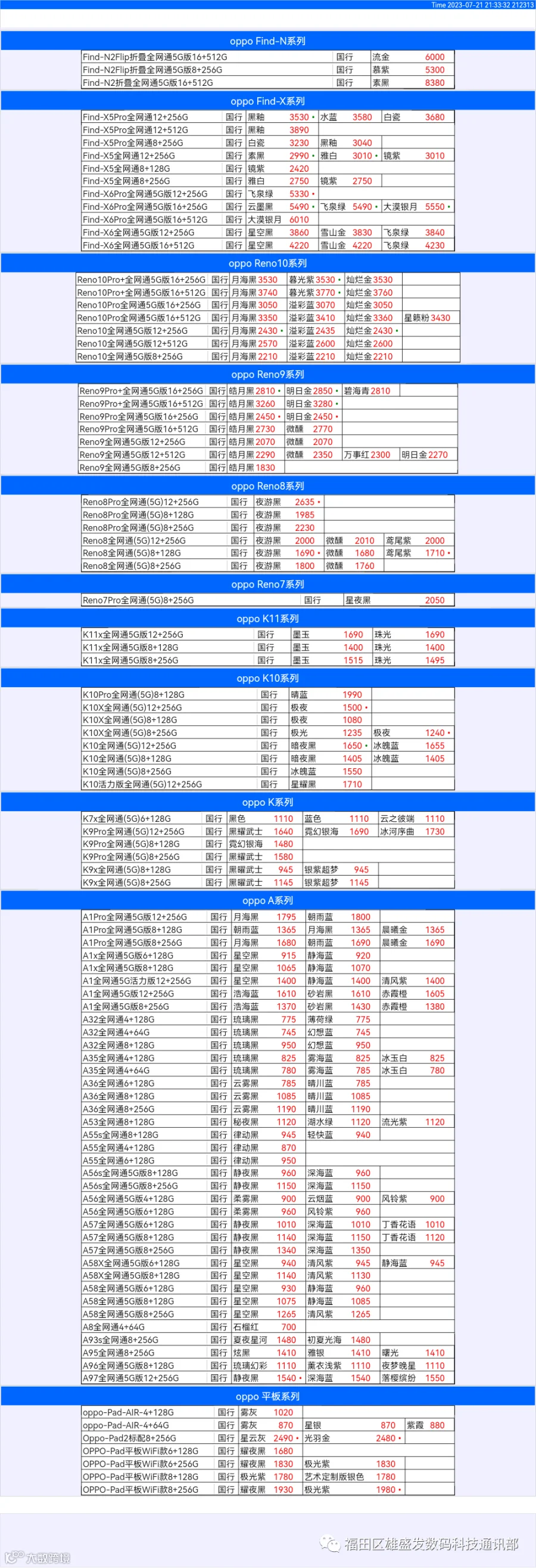 新机报价【2023年7月21日】OPPO   VIVO  IQOO   一加   真我 芯烨微 电子科技