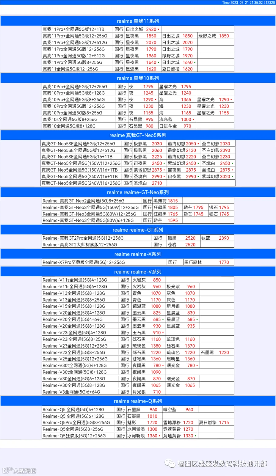 新机报价【2023年7月21日】OPPO VIVO IQOO 一加 真我
