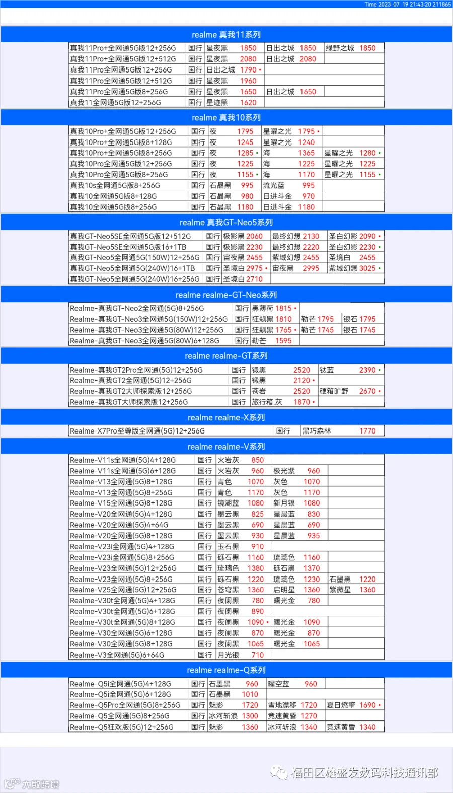 新机报价【2023年7月19日】OPPO VIVO IQOO 一加 真我