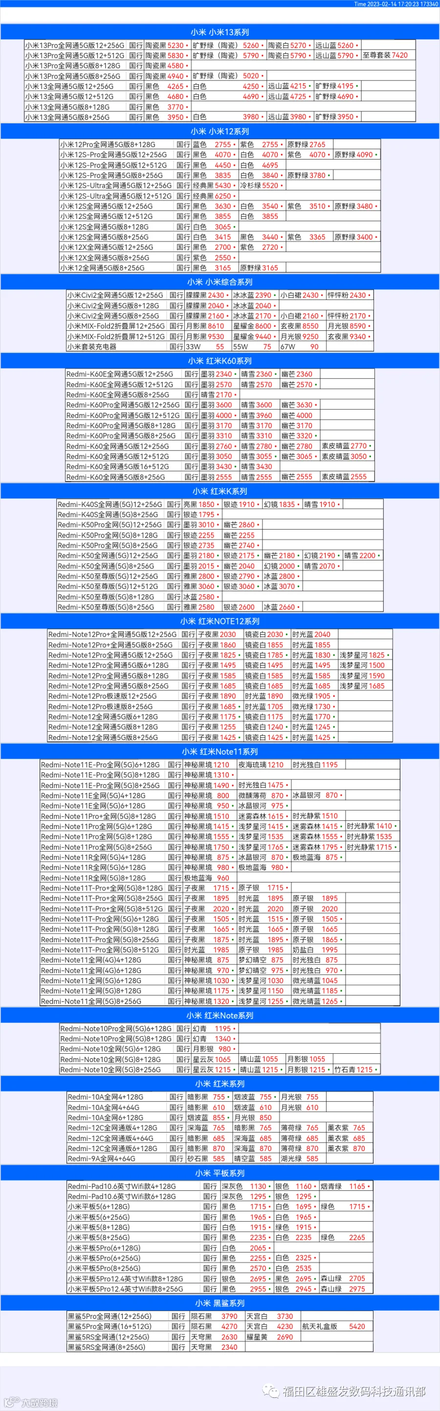 新机报价【2023年2月14日】小米  红米   黑鲨   报价 芯烨微 电子科技