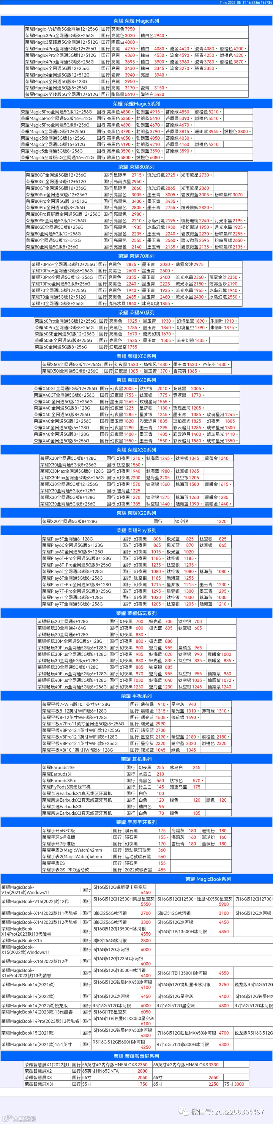 新机报价【2023年5月11日】华为 荣耀 报价