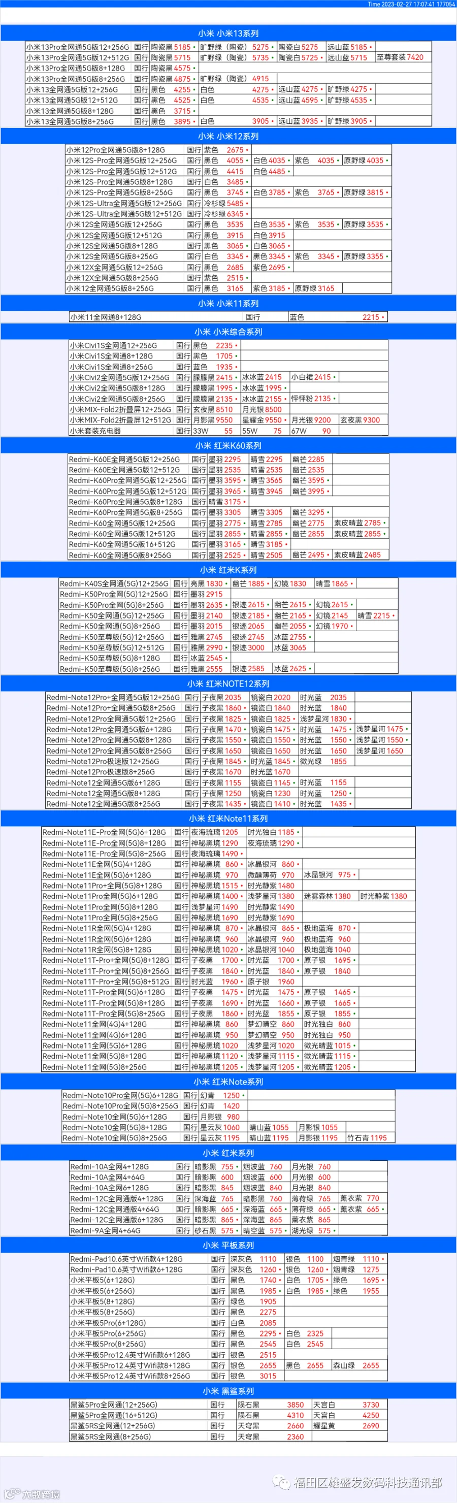 新机报价【2023年2月27日】小米  红米   黑鲨   报价 芯烨微 电子科技