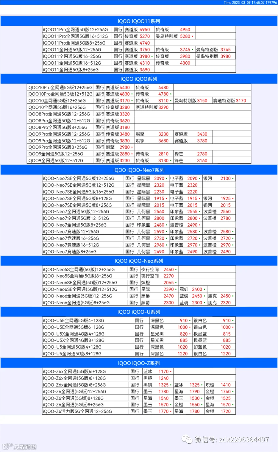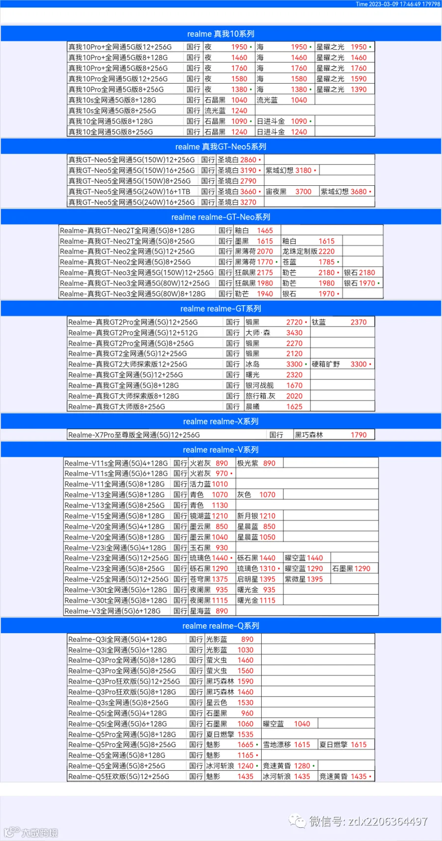 新机报价【2023年3月9日】OPPO VIVO IQOO 一加 真我
