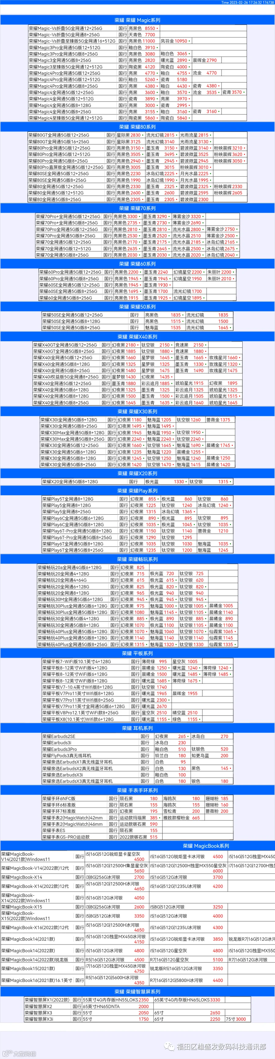 新机报价【2023年2月26日】华为 荣耀 报价
