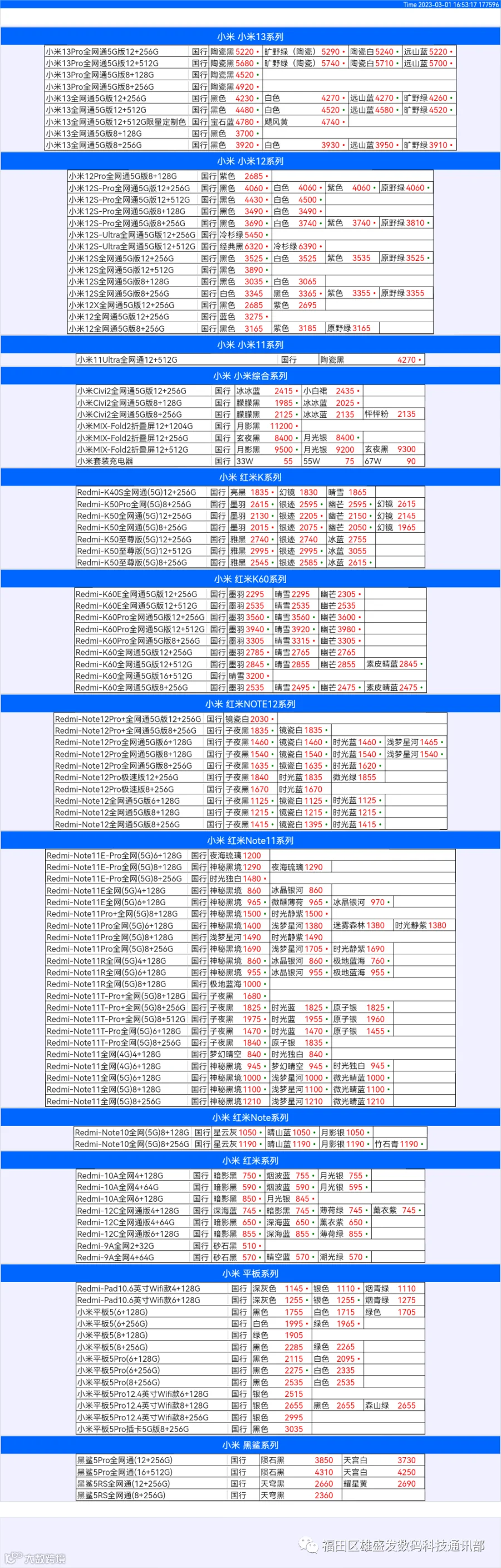 新机报价【2023年3月1日】小米  红米   黑鲨   报价 芯烨微 电子科技