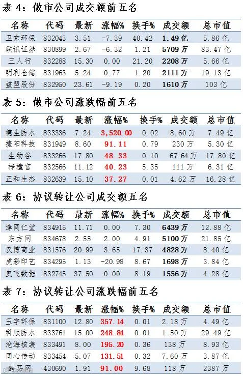 做市企业中有864只个股参与交易,成交额6.83亿元。其中191只个股上涨;13家做市企业成交额破千万,其中卫东环保、联讯证券和三人行位列前三位,分别成交1.49亿、5709万元和2208万元。