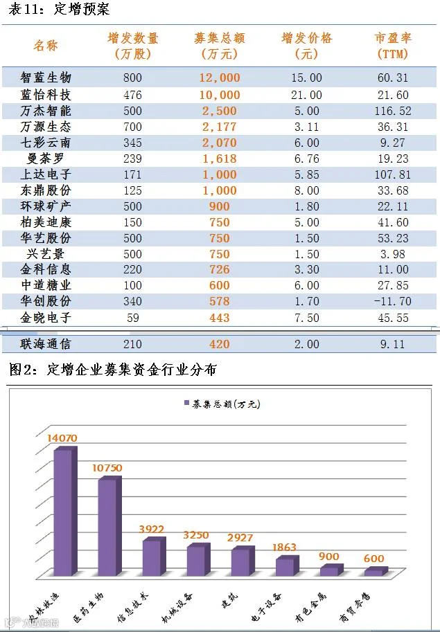 点评:3月16日,共有17家公司公布定增预案,总增发股数5935股,共募集资金3.82亿元。募集资金超过1亿元的有2家,募集资金最大为智蓝生物,募集资金3.82亿元,总体来看,募集金额流向农林牧渔、医药生物行业较多。