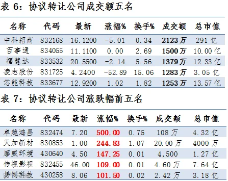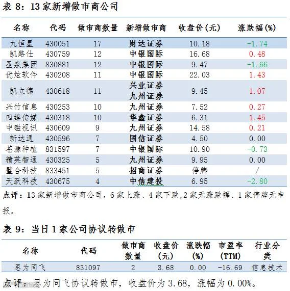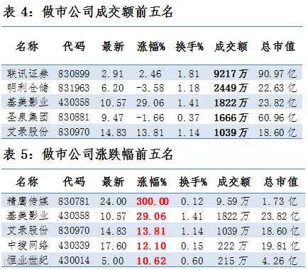 做市企业中有578只个股参与交易,成交额跌至4.90亿元。其中232只个股上涨;仅5家做市企业成交额破千万,其中联讯证券、明利仓储和基美影业位列前三位,分别成交9217万、2449万元和1822万元。