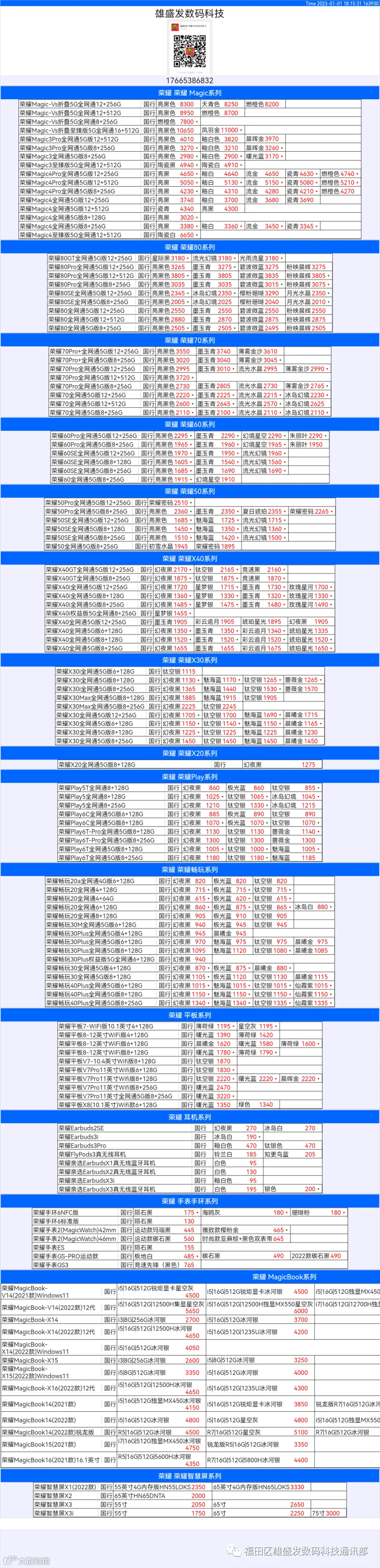 新机报价【2022年1月1日】华为 荣耀 报价