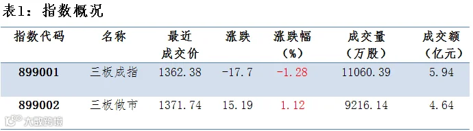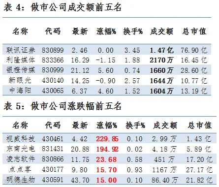 做市企业中有566只个股参与交易,成交额6.04亿元。305只个股上涨;11家做市企业成交额破千万,其中联讯证券、利隆媒体和银橙传媒居前,分别成交1.47亿元、2170万元和1660万元。