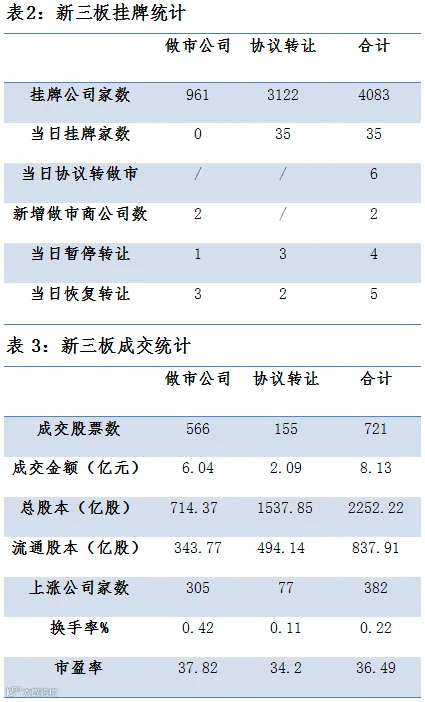 昨日三板共计721只股票成交,总成交额8.13亿,其中做市成交6.04亿,协议成交2.09亿元。