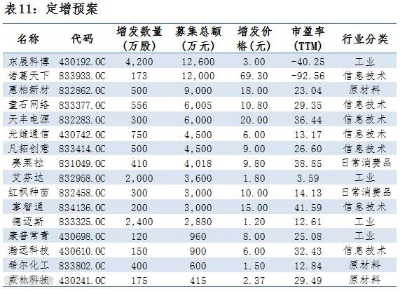 点评:11月11日,共有14家公司公布定增预案,总增发股数1.31亿股,共募集资金7.40亿元,两家家公司募集资金超过1亿元,募集资金最大为东展科博、募集资金1.26亿元,总体来看,募集资金较多流向信息技术行业。