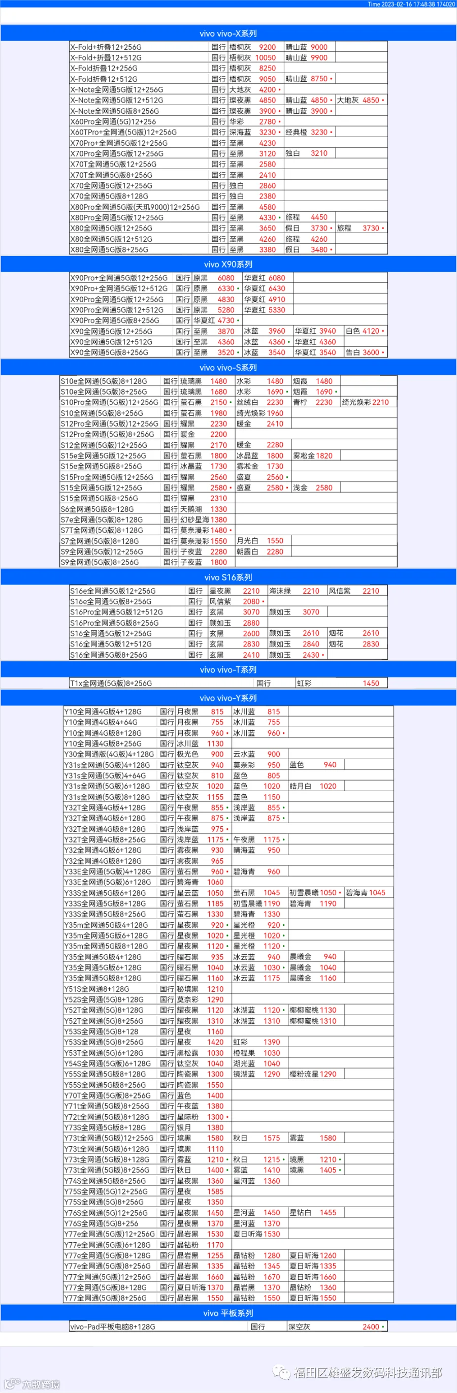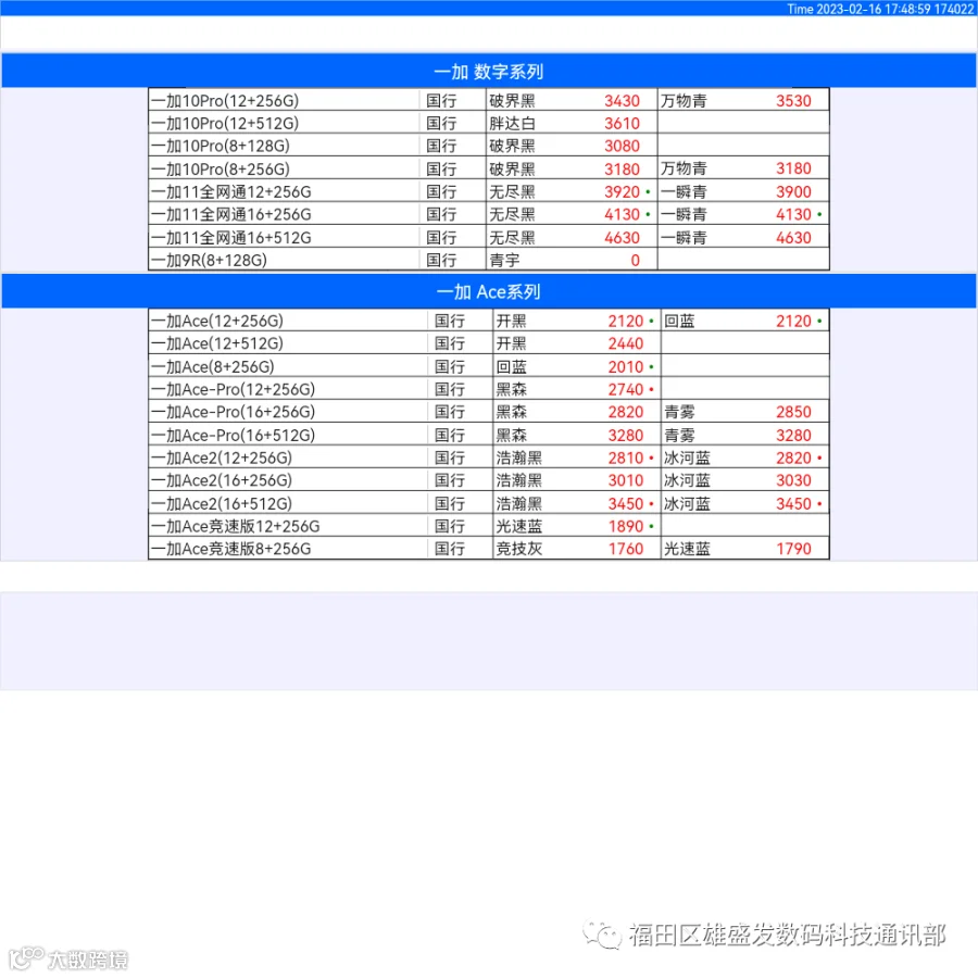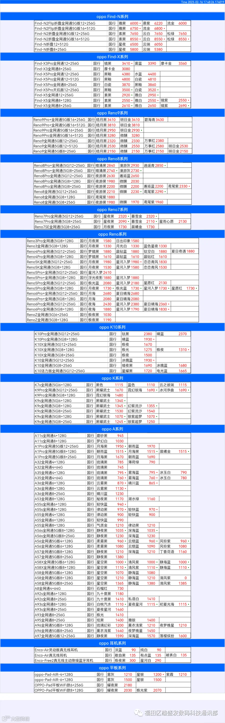 新机报价【2023年2月16日】OPPO   VIVO  IQOO   一加   真我 芯烨微 电子科技
