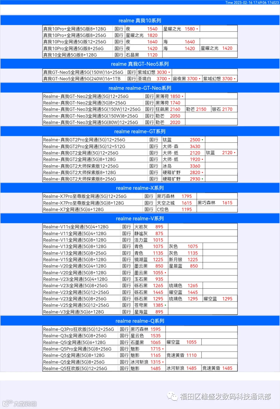 新机报价【2023年2月16日】OPPO VIVO IQOO 一加 真我