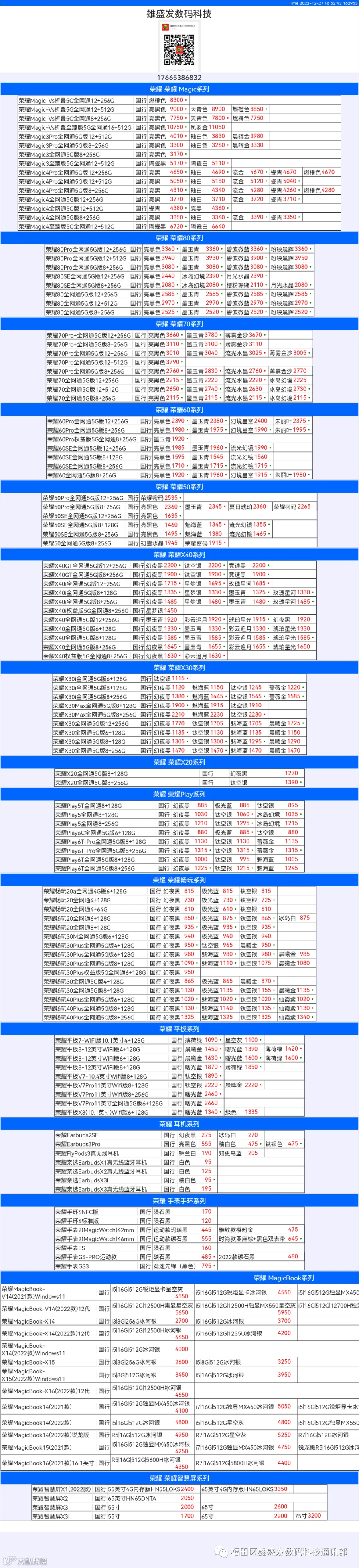新机报价【2022年12月27日】华为   荣耀 报价 芯烨微 电子科技