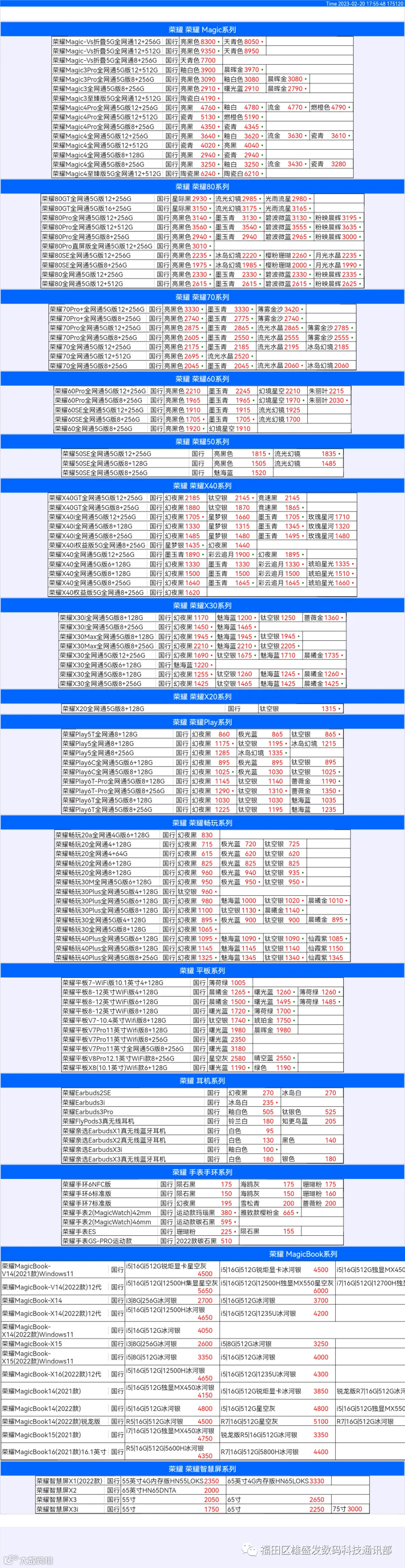 新机报价【2023年2月20日】华为 荣耀 报价