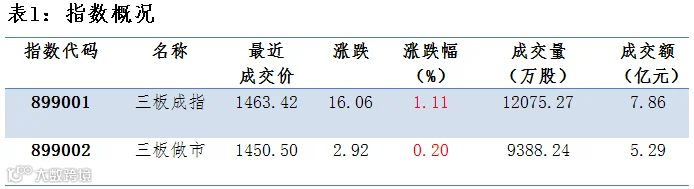 做市企业中有604只个股参与交易,成交额7.07亿元。其中268只个股上涨;10家做市企业成交额破千万,其中联讯证券、明利仓储和西部超导位列前三位,分别成交1.28亿、1.05亿元和3439万元。