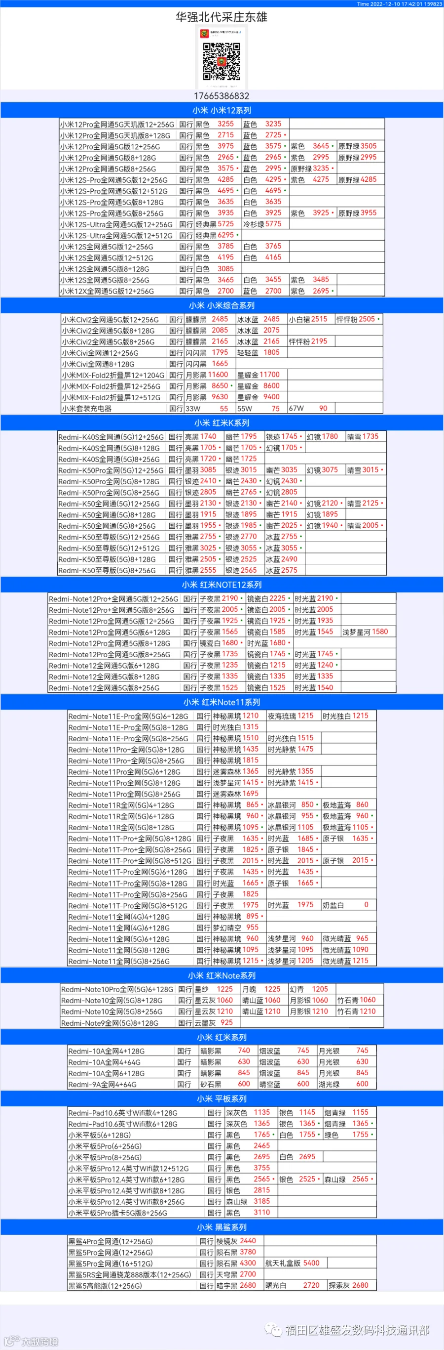 新机报价【2022年12月10日】小米  红米   黑鲨   报价 芯烨微 电子科技