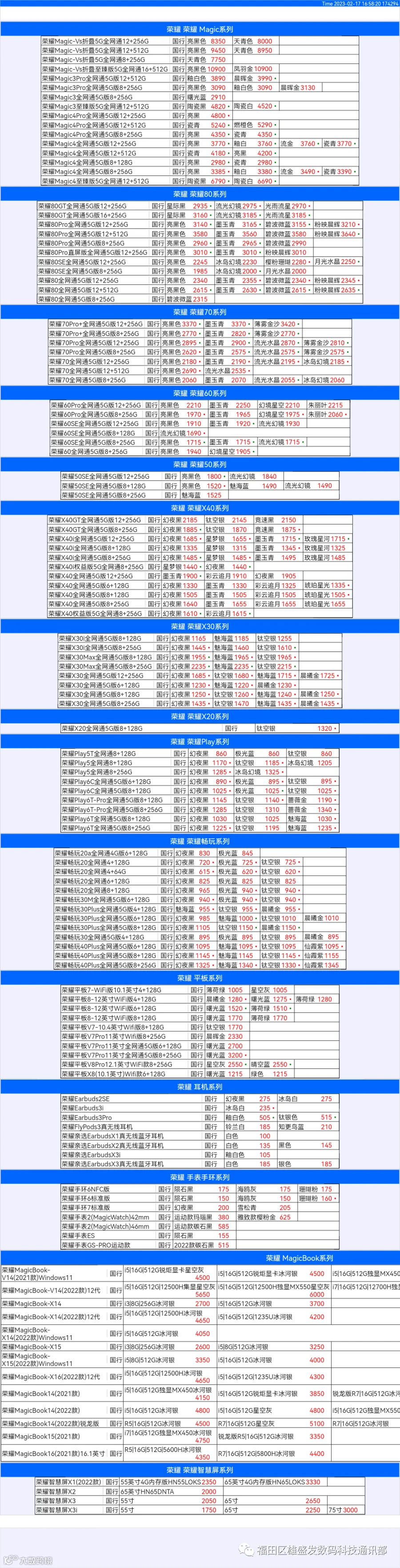 新机报价【2023年2月17日】华为   荣耀 报价 芯烨微 电子科技