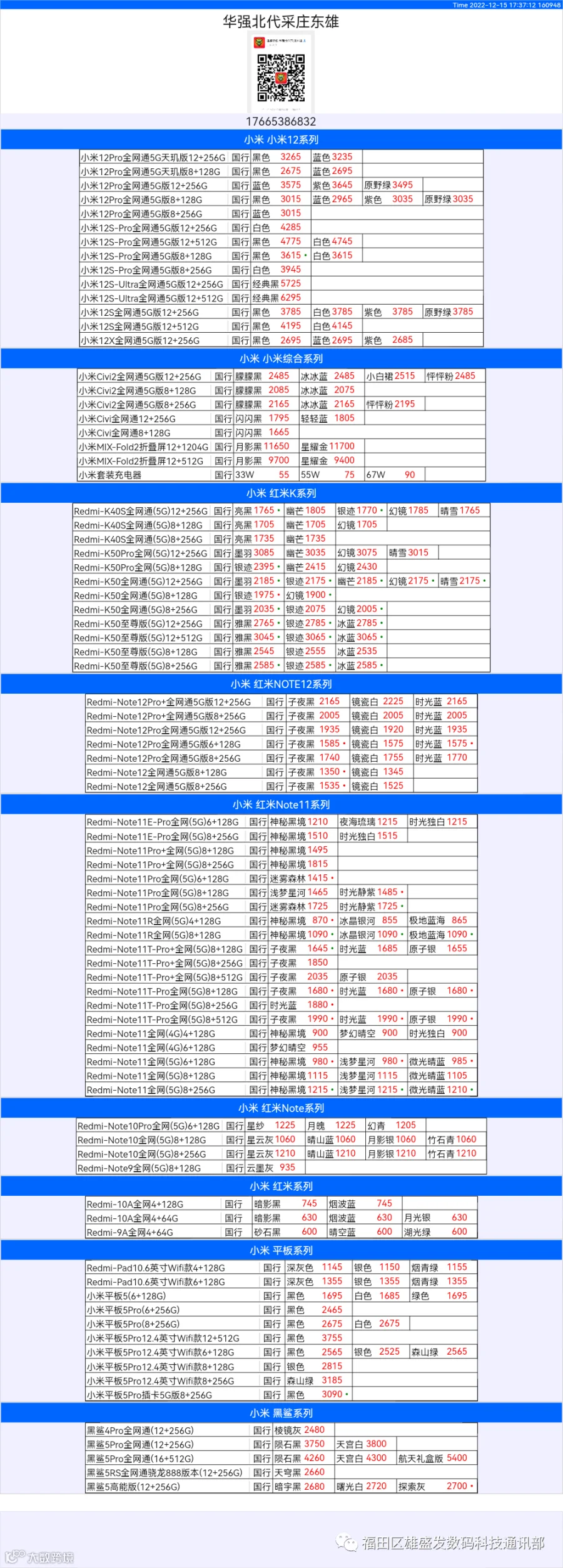新机报价【2022年12月15日】小米  红米   黑鲨   报价 芯烨微 电子科技