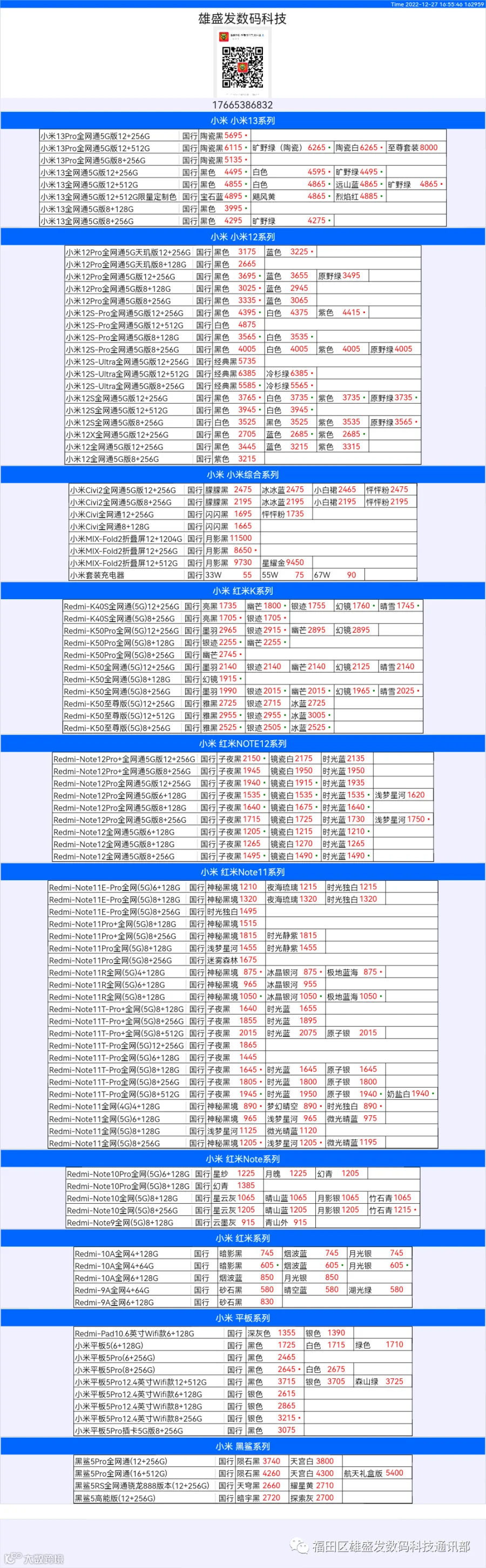 新机报价【2022年12月27日】小米  红米   黑鲨   报价 芯烨微 电子科技