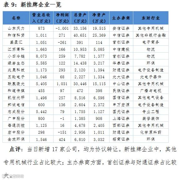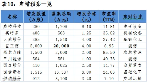 点评:9家公司共募集4.48亿元,定增企业行业分布中能源与基础化工行业占比较大,募集资金最大的为巨正源,募集资金2亿元。