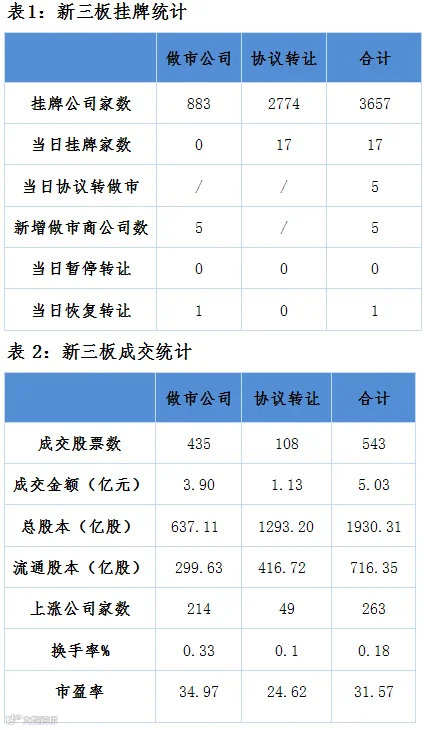 新三板报543只个股参与交易,其中263只个股上涨。成交额较昨日有所萎靡,报5.03亿元。其中做市公司成交3.90亿、协议转让公司成交1.13亿