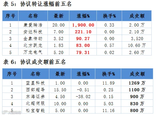 涨跌幅方面,仅2只股票涨幅超过100%,分别是康爱瑞浩与安达科技,涨幅分别为1900%、221.10%。相比之下,爱科凯能、棒杰小贷和太阳传媒则跌幅居前分别为88.68%、75.79%和69.80%。