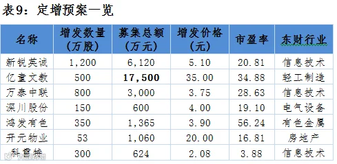 点评:7家公司共募集3.03亿元,定增企业行业分布中信息技术行业占比较大,募集资金最大的为亿童文教募集资金1.75亿元。