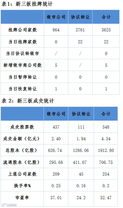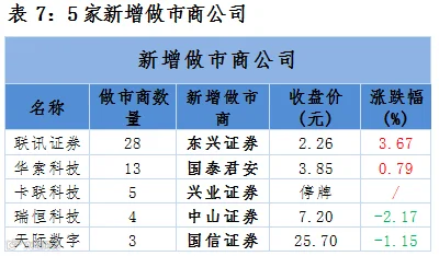 点评:5家新增做市商公司,2家上涨、2家下跌、1家停牌无申报。
