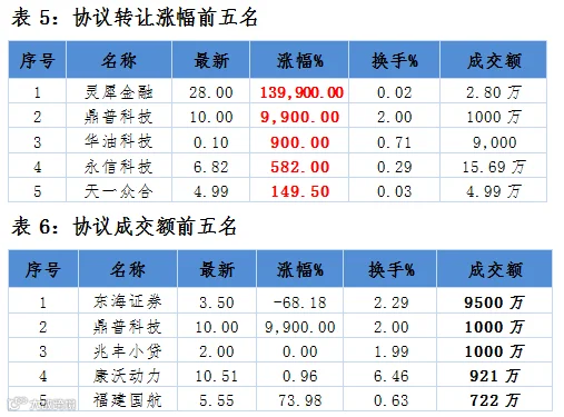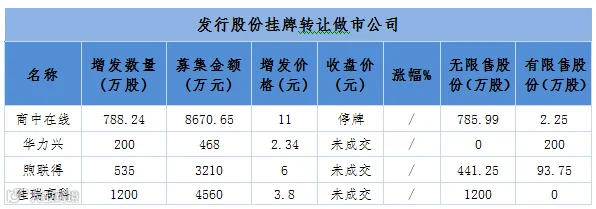 表10:昨日19家公司新增发行股份并挂牌转让:4家做市公司、15家协议转让公司分别为金瀚高新、威尔凯、润龙包装、金田科技、合一康、乔扬数控、埃林哲、世游科技、瑞丰股份、宇都股份、怡莲蚕桑、八亿时空、疆能股份、科伦股份、九方天和。